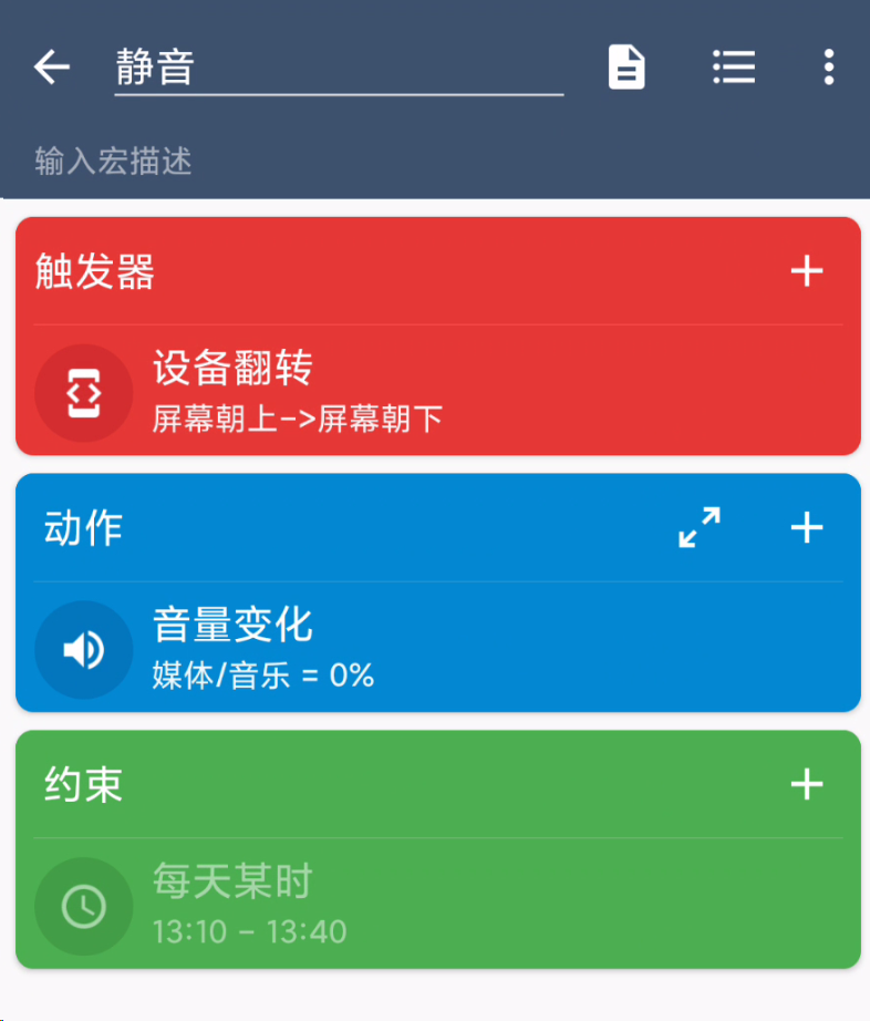 设定好限制时间,就能在指定时间,翻转一下手机自动静音了。在早上去公司的路上,也可以设定成在指定时间,连接上耳机的时候,自动打开某个软件并播放音乐。又或者是摇一摇切歌等,只要加好限制条件就能较少很多误操作。