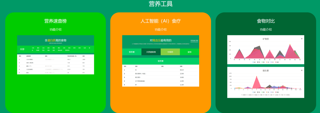包括了营养速查榜、人工智能(AI)食疗、食物对比等等。