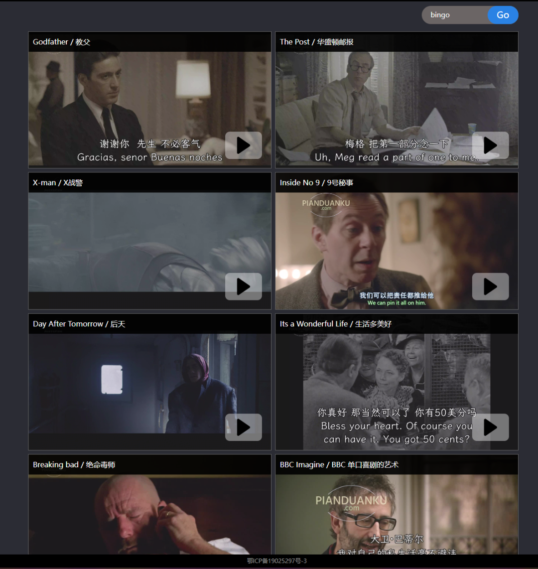 输入单词或短语,一键查找经典国外电影片段,当你输入英文的时候,后台会精准匹配片段中出现的英文。当你输入中文时,后台会进行 GPT 搜索。