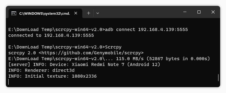 接着拔掉数据线命令输入:adb connect 192.168.4.139:5555,之后再输入 Scrcpy 命令就可以无线投屏了。