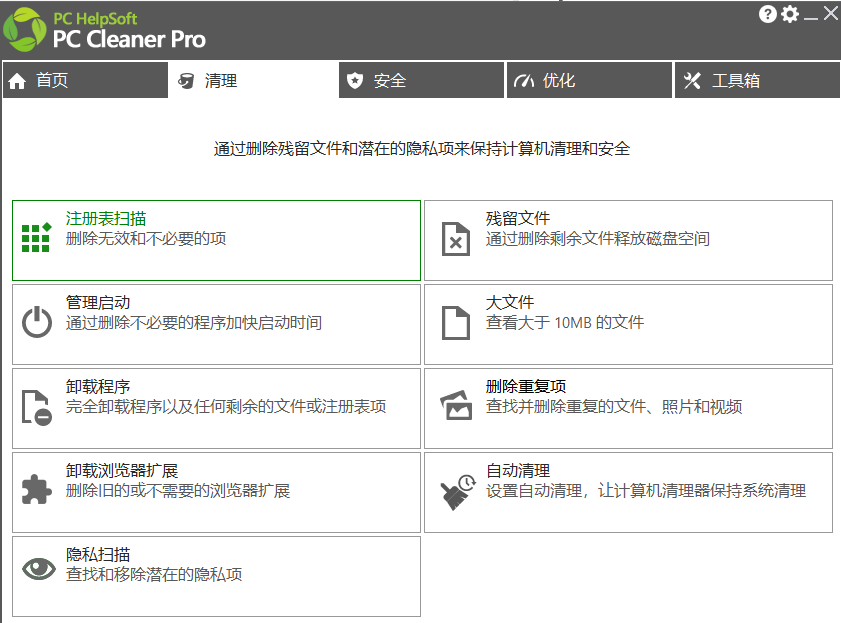 然后就是清理板块,包括更专业的注册表扫描、残留文件,管理启动、大文件清理、卸载程序、删除重复项、自动清理等等。