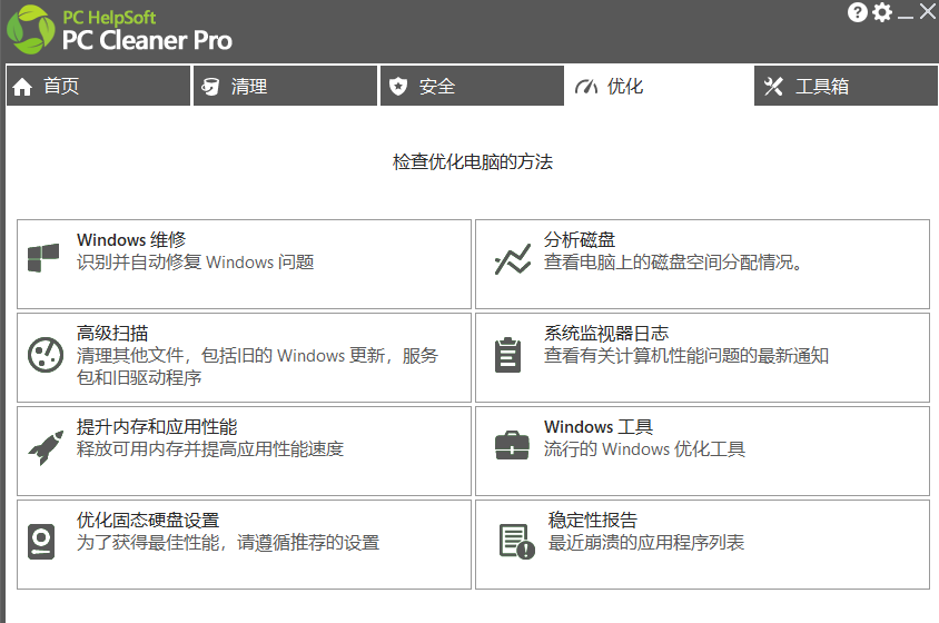 优化板块包括了分析磁盘、提升内存和应用性能、优化固态硬盘设置等。