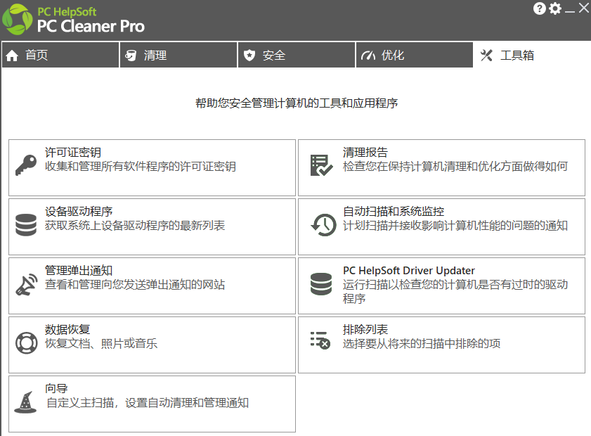 工具箱包括了许可证密钥、清理报告、数据恢复等。