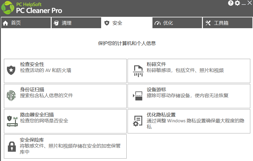 安全板块包括安全性、粉碎文件、路由器安全扫描、优化隐私设置等。