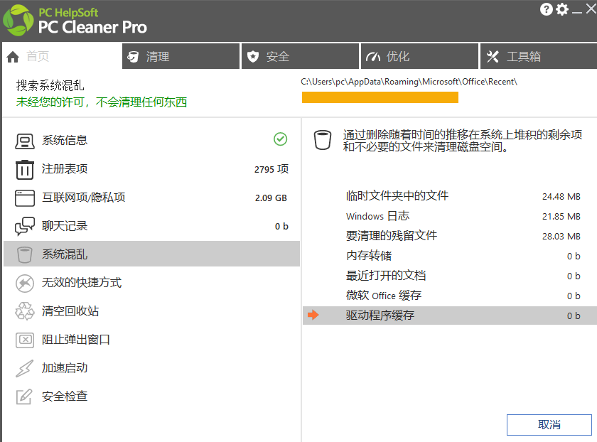 首页可以直接通过扫描进行清理,包括注册表项、互联网项/隐私项(主要就是浏览器)、无效快捷方式、清空回收站等等。
