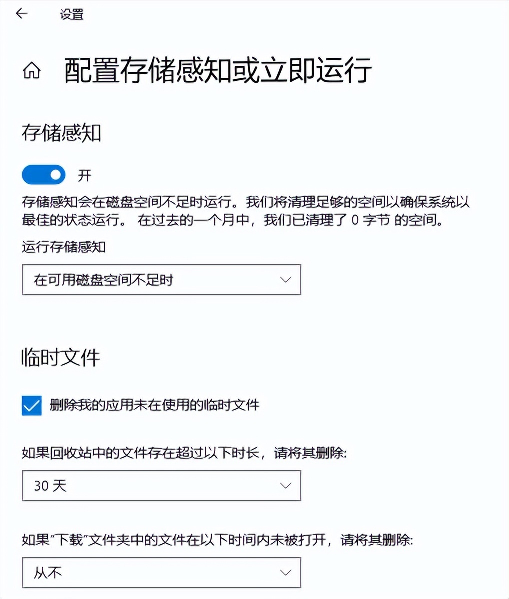 开启之后,存储感知会在磁盘空间不足时运行,自动删除一些不需要的文件,比如临时文件、回收站的内容。