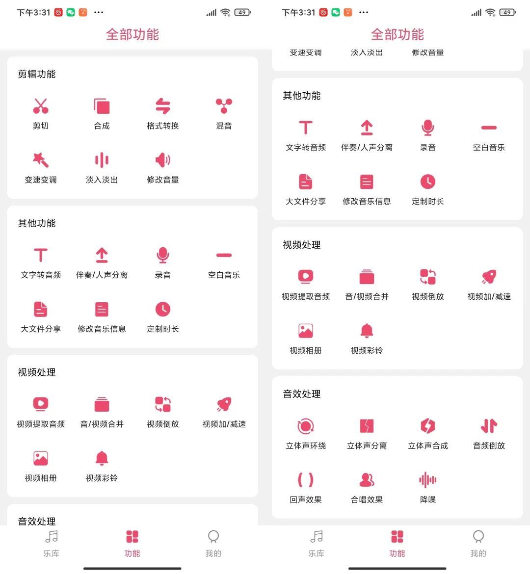 这是一款手机端的音频修剪神器!它的功能非常强大,你可以将音乐剪辑大师当做专门剪辑音乐的工具,今天主要跟大家介绍几个兔兔平时比较常用的功能:剪辑功能、其他功能、视频处理、音效处理。