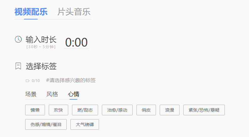 使用很简单,首先是设置音乐时长,然后设置选择对应的场景、风格、和心情标签,最多上限 10 个标签,然后就可以一键生成在线试听或者下载到本地,下载需要注册登录(当然也可以使用 IDM 之类下载器直接嗅探下载)。