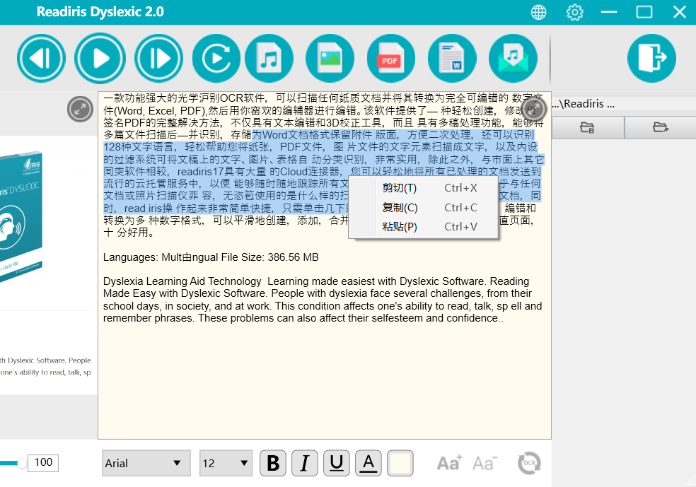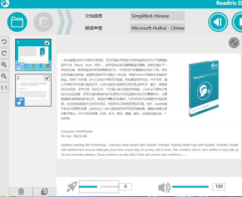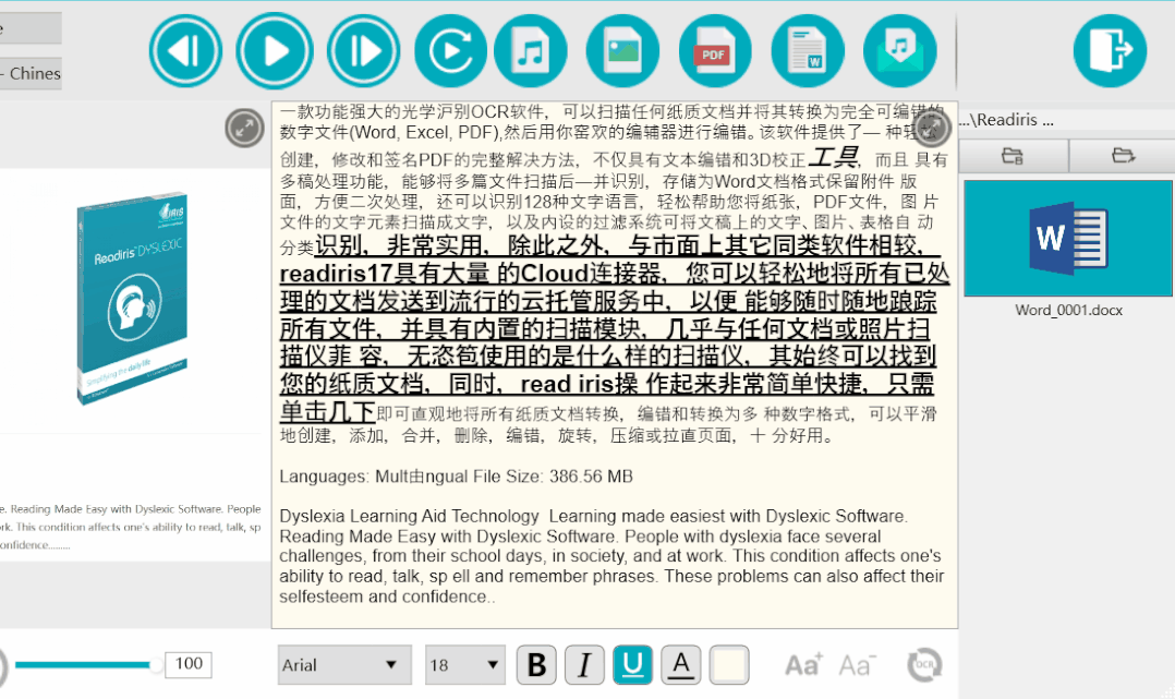 Readiris Dyslexic 的功能可以总结为:批量扫描图片并生成可以编辑的 Word、Excel、PDF,导出音频和图片、朗读文字内容。