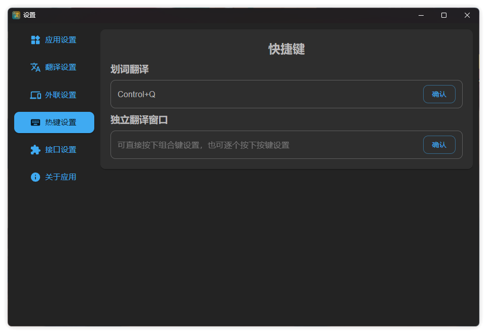 软件默认是没有设置快捷键的,你需要手动设置一个快捷键之后划词后按下快捷键才能触发翻译。另外也支持设置独立翻译窗口的快捷键。