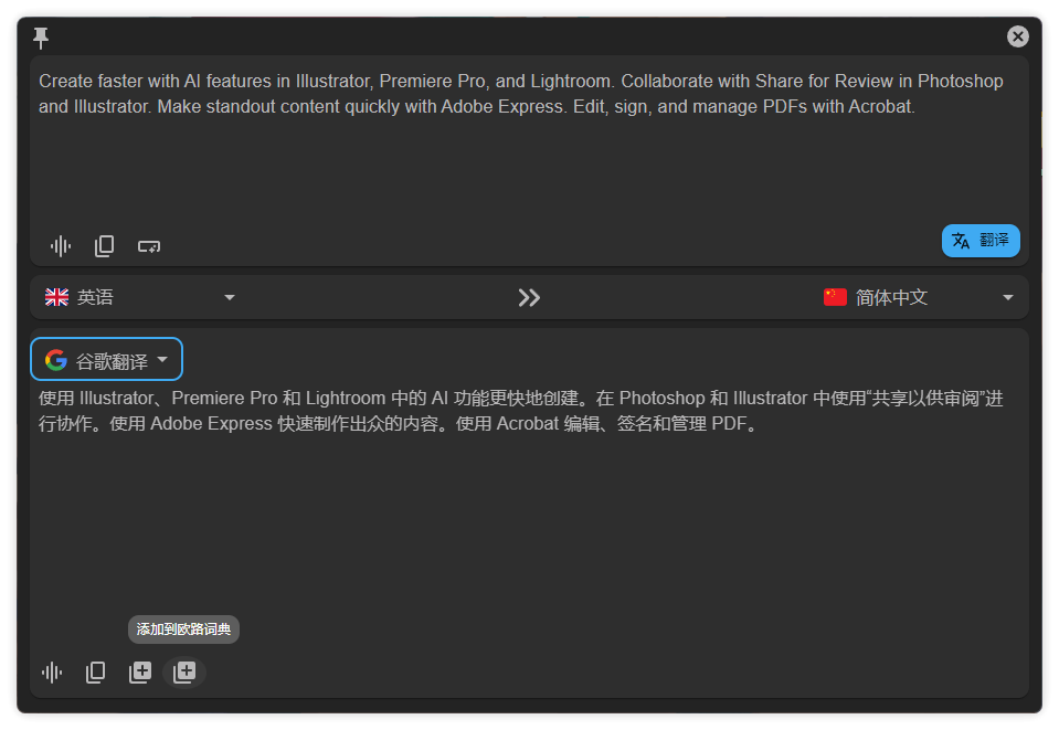 如果你需要文本内容翻译,可以直接打开翻译窗口,还支持朗读功能,以及把翻译结果整合欧路词典或者 Anki 生词本。