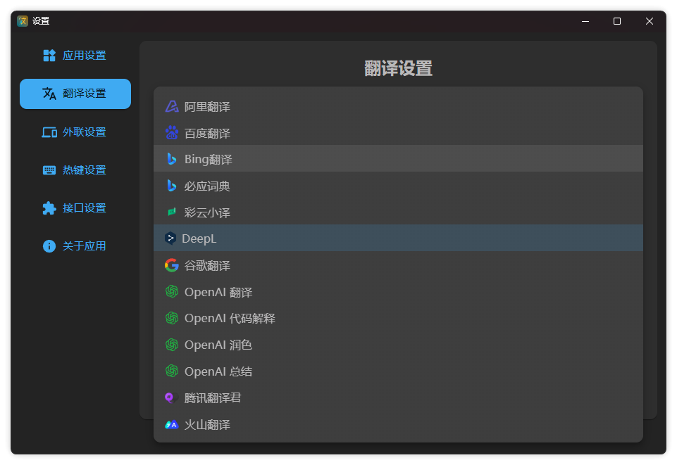 默认的翻译接口是 DeepL,如果你需要选择其它翻译接口,点击设置里选择即可,需要注意的是部分翻译接口,需要你自己申请相关的 API 服务。