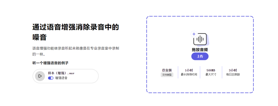 这是 Adobe 出品的免 AI 去除音频背景噪音工具,使音频具有专业录音室的音质。使用需要登陆 Adobe 账号,支持 MP3 和 WAV 音频格式,上传最大 1GB,时长不超过 1 小时,每日限制 3 小时。