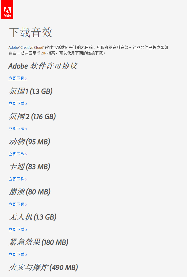 Adobe 官方出品的音效库包,含氛围音效、卡通音效、拟音脚步、恐怖等各种音效素材,可以用于制作音频和视频,以便创作者创造优秀的作品。