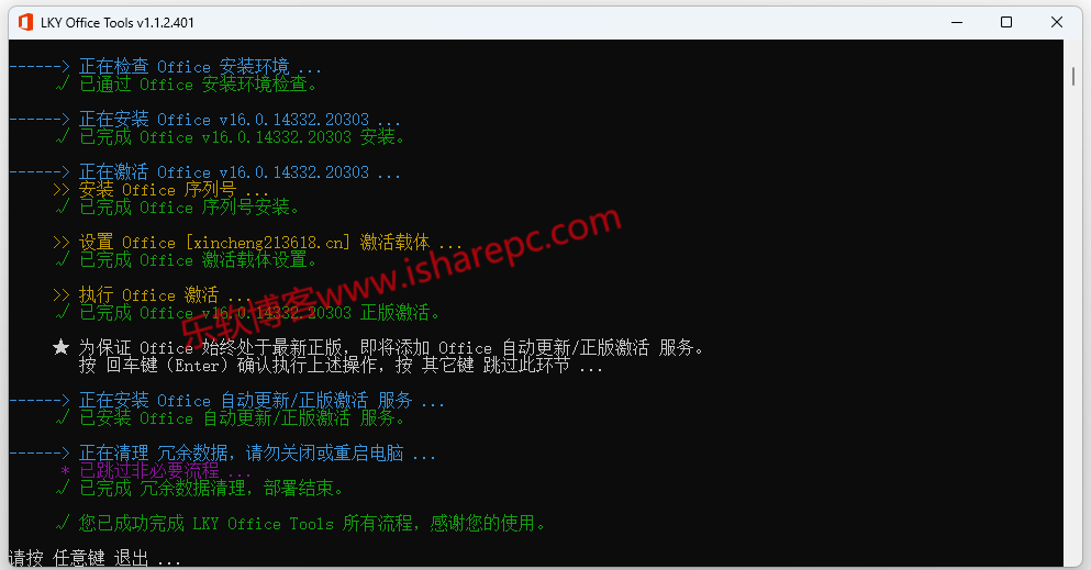 下载完成后,会自动KMS命令激活Office,看了下设置的KMS服务器可能是作者的博客,这个倒无所谓,能用就行,同时它也会安装续期服务,以此180天循环一次。