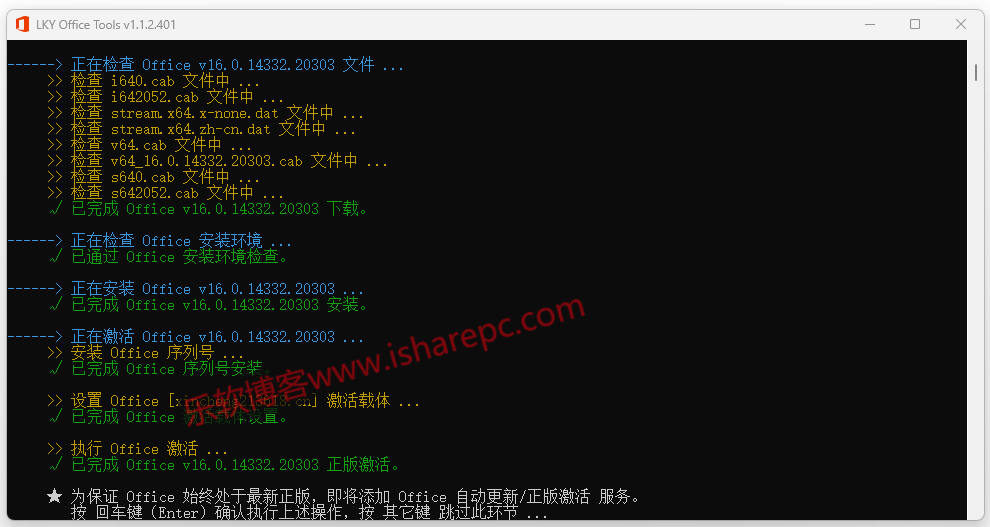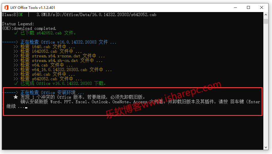 如果你电脑上有安装了其他版本的Office,工具会提示你是否升级。回车代表同意,并且它会卸载你当前已安装的Office~