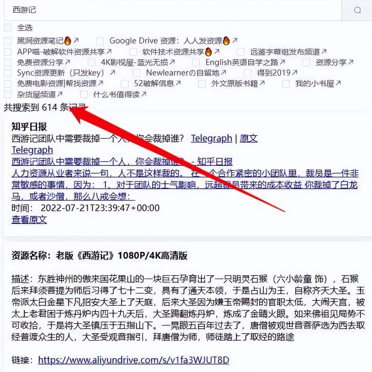 比如说搜索“西游记”,它就会提供影视、书籍、讨论话题等相关资源,如果仔细观察,可以看到,一共有614条相关结果。