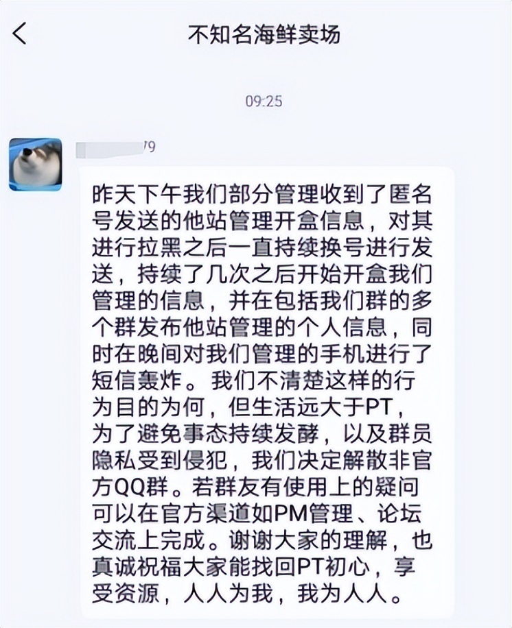 开盒者先是发送其他站点的管理信息以作威胁,不奏效后,开始升级【开始开盒管理的信息,并在多个群发布他站管理的个人信息,同时在晚间对我们管理的手机进行了短信轰炸。】,该站点无奈解散QQ群,攻击停止了