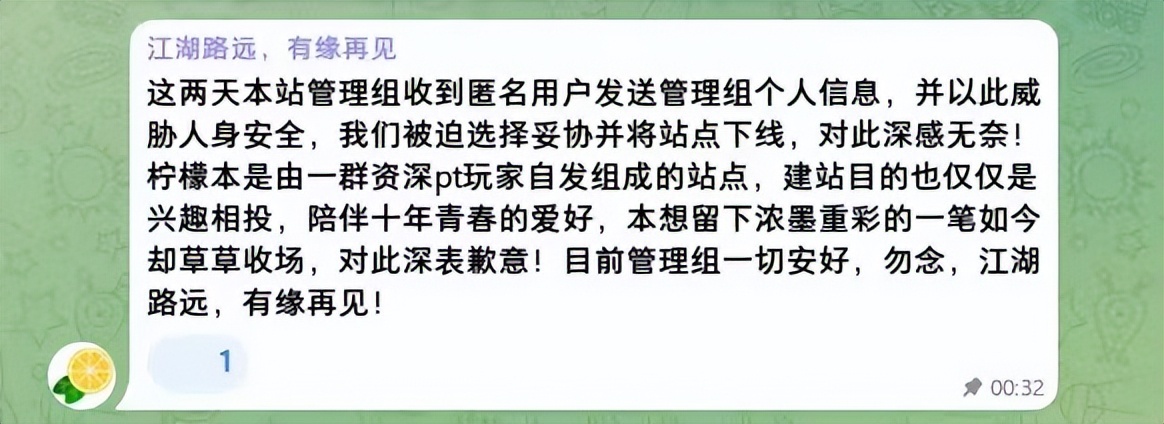 开盒者开始转向威胁柠檬,柠檬选择永久关闭站点。这是续老岛灭亡后,第一个永久关闭的公认大站。同时也是一个对pter相对宽松的站点。以下为柠檬发布的公告: