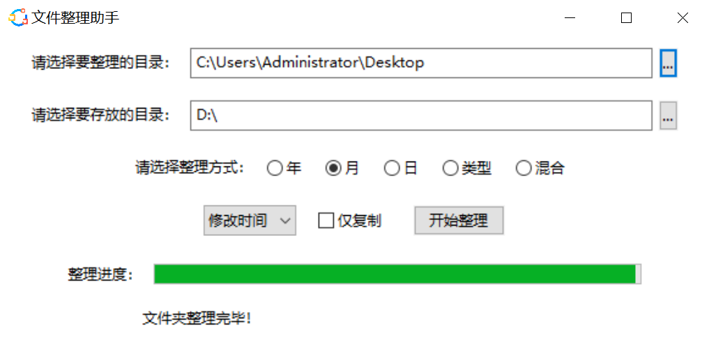 选择要处理的文件夹和存放的目录,就能以五种方式进行整理,分别是:年、月、日、文件类型、混合整理。最后一个混合整理的方式,光听名字可能有点懵,其实它指的是先建立一个文件类型的文件夹,然后再以文件时间进行分类。
