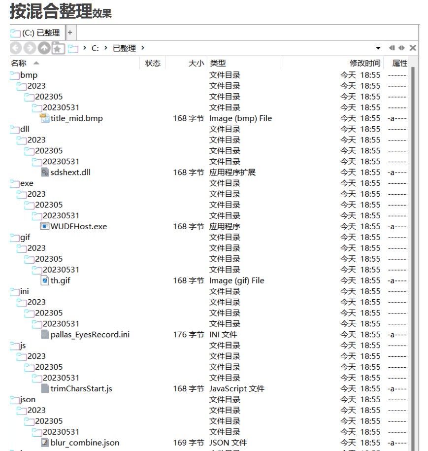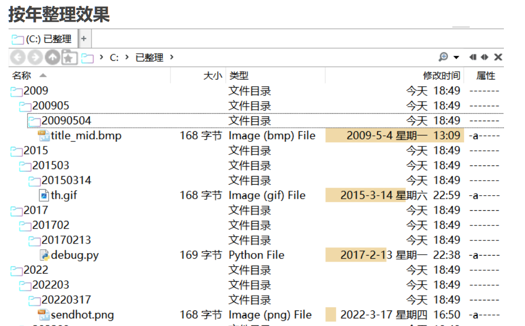 点击整理之后,就会按照对应的格式来生成文件夹并将文件丢进去,这样能很方便地查看那些时间距离较远的文件,而有文件归档需求的朋友,像是一些文书电子档、活动策划文件、信息收集的存档,根据实际情况按时间保存或许更加方便,用上“文件整理助手”能一键完成,节省大量筛选目录的时间。