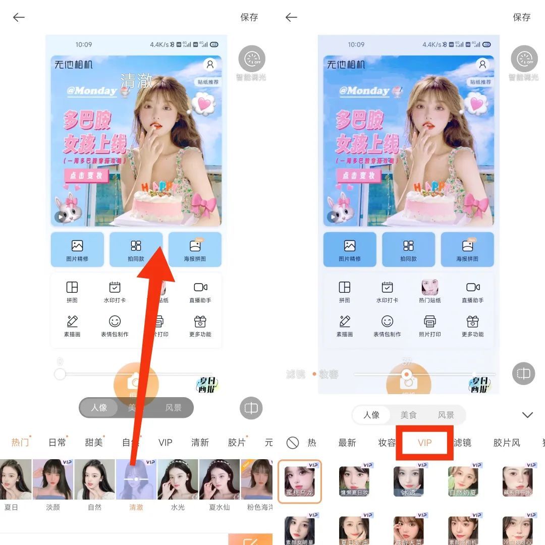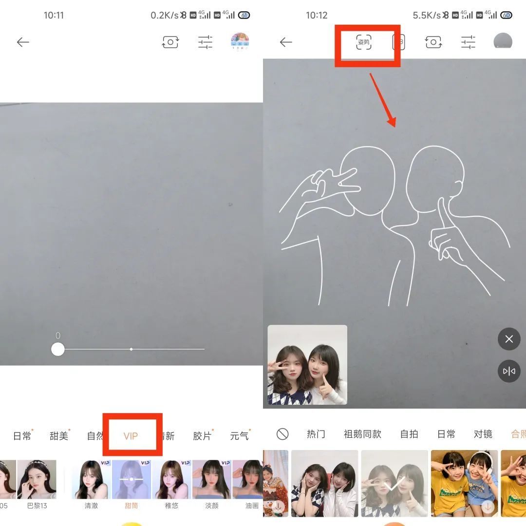 滤镜、美颜什么的就不多介绍了,反正所有的vip内容随意用!最让兔兔眼前一亮的是【姿势】功能!超多拍照姿势随意挑选,不管是自拍、对镜,还是合照、外景等,只要按姿势图摆Pose就行了,出图立马生动有趣!一键告别那个只会比剪刀手僵硬的自己~