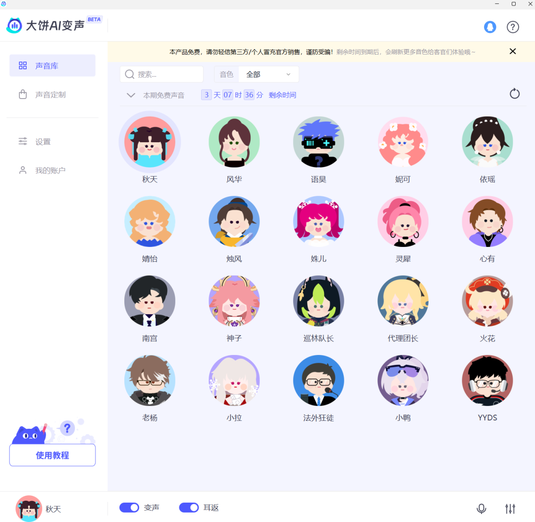 - 游戏开黑:可以使用符合你虚拟人设的声音皮肤,从而更好地带入角色,沉浸于游戏世界中。比如你可以选择秋天、墨玉、瑶池、妮可、烛风等不同风格的音色。