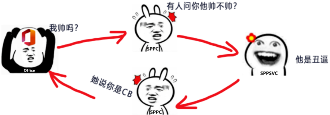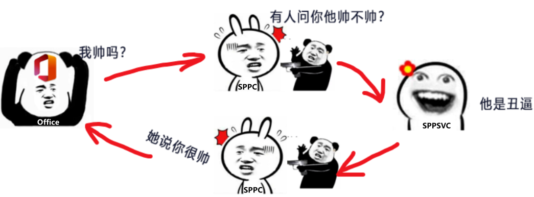 sppc.dll链接到Office目录下,改名为sppcs.dll,用破解的sppc.dll劫持sppcs.dll,在询问激活状态时,谎报结果即可骗过Office。Office真的以为自己被激活了,但是Windows并没有认为它已经被激活。但这已经不重要了,Office自认为被激活就可以了,所有功能都拿去用吧。在甜言蜜语的糖衣炮弹中,Office迷失了自我