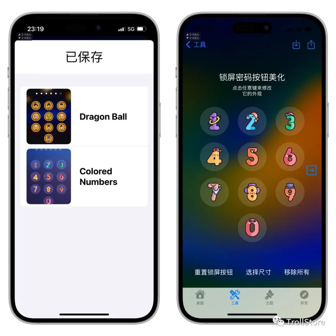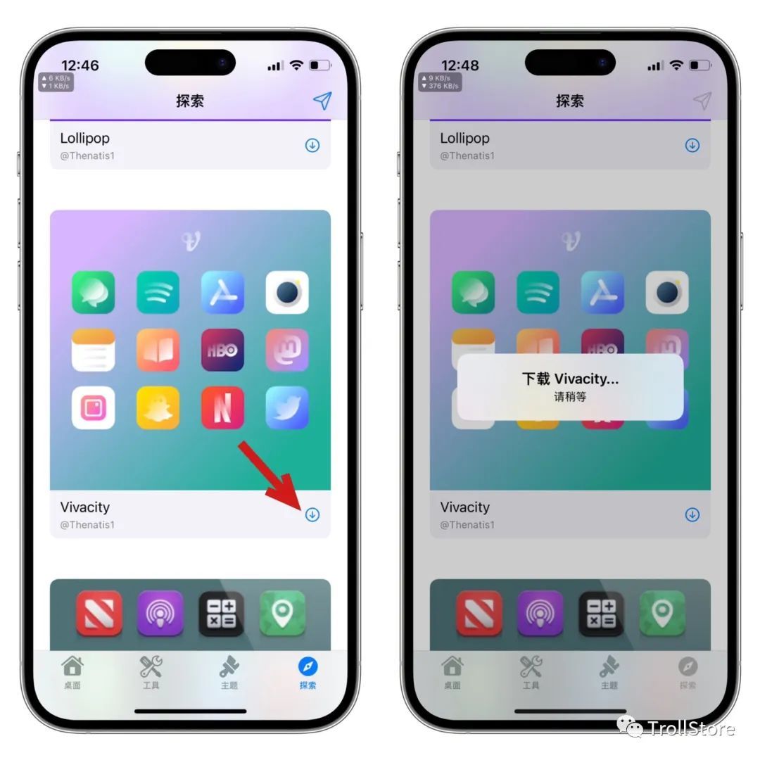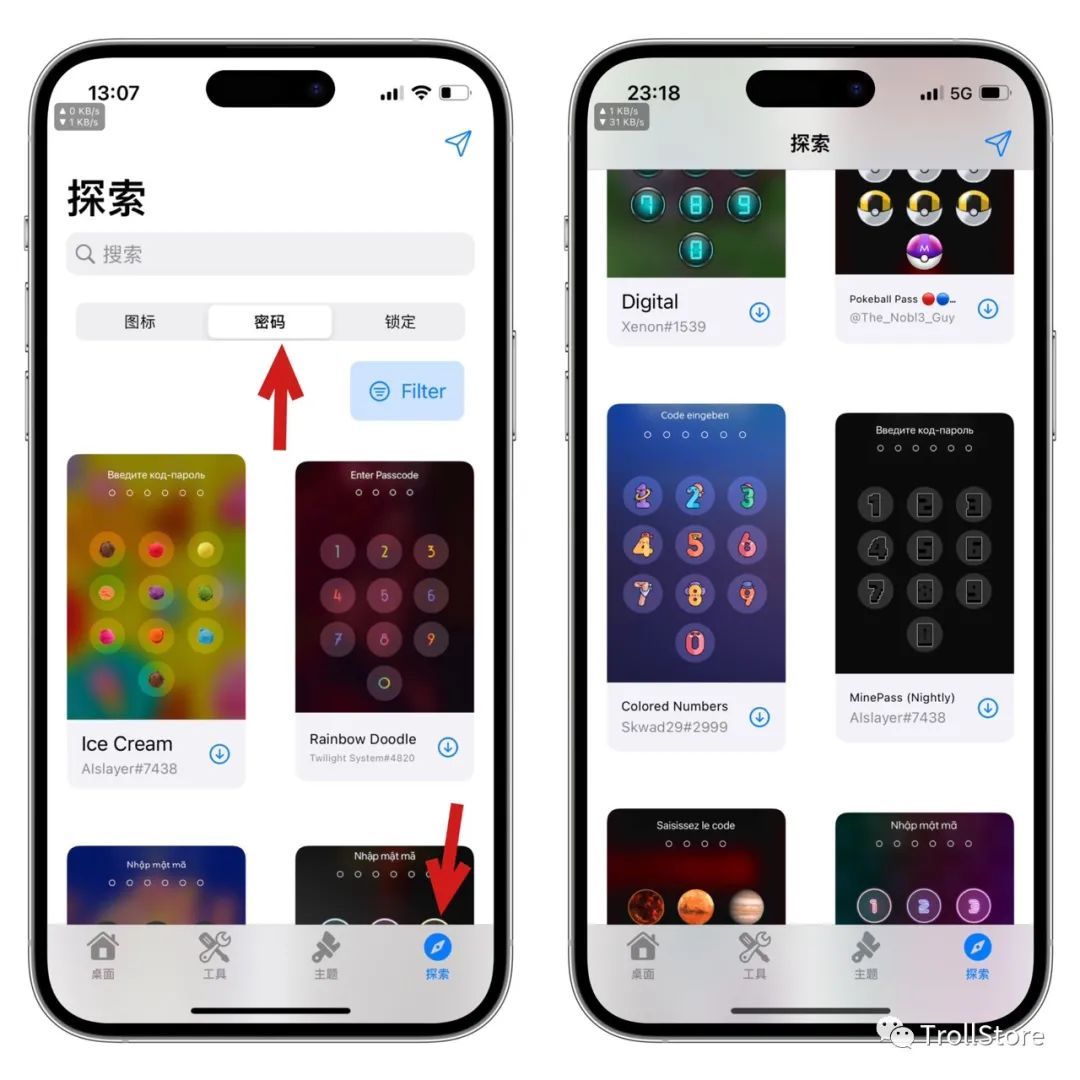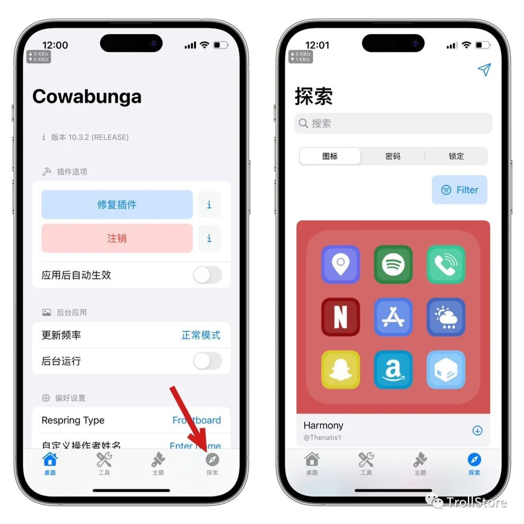 一样的打开cowabunga多功能工具箱,点击右下角探索,点击,密码,然后找到自己喜欢的图标,点击下载按钮,下载。