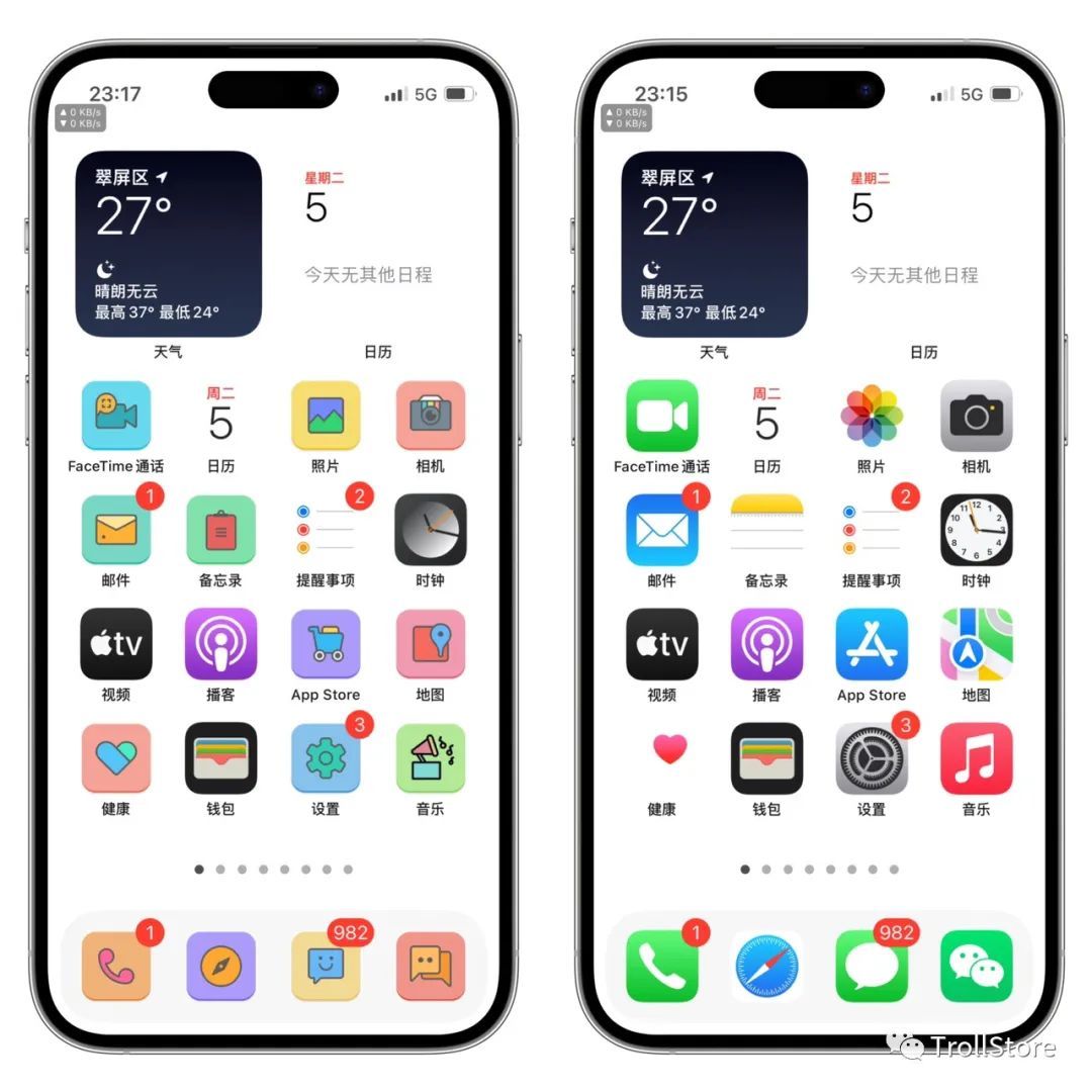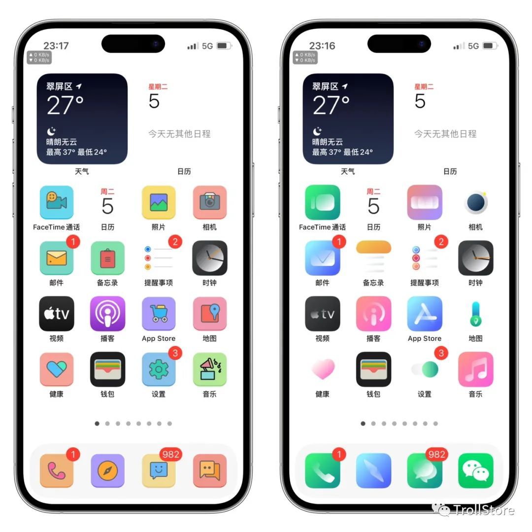 - 支持 Dock 背景透明,隐藏手手势小横条,文件夹背景透明,移除多任务后台模糊,移除控制中心模块背景,移除资源库背景等等。