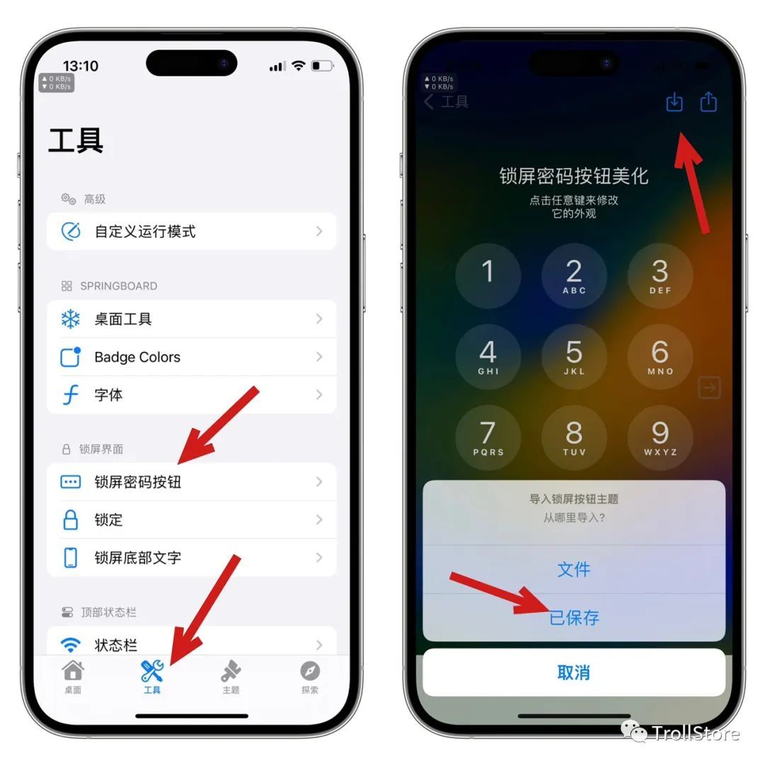 下载完成以后,点击cowabunga多功能工具箱底部工具,再点击锁屏密码按钮,点击右上角箭头所指图标,然后点击已保存,这个已保存的意思就是我们刚刚 下载好了的那个,如果点进去没有,那么还是可以把手机注销一下,或者关机重启。