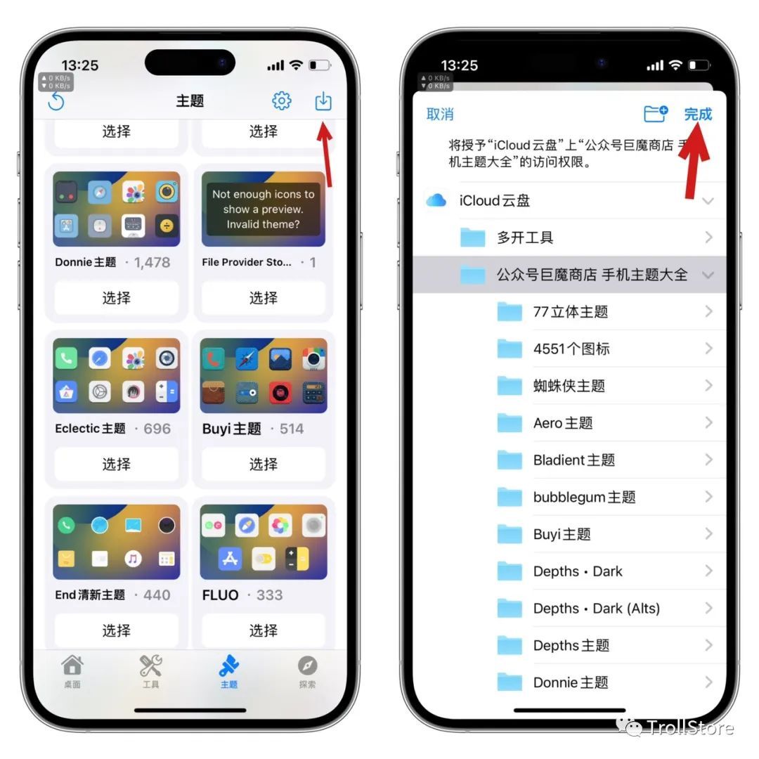 如果你自己有喜欢的主题,你可以先把主题存储到手机文件里面。至于如何导入导入到cowabunga里面,你可以在cowabunga主题界面,点击上图右上角这个按钮,然后选择你自己的主题点击完成即可,如果没有解压文件,记得提前解压文件。