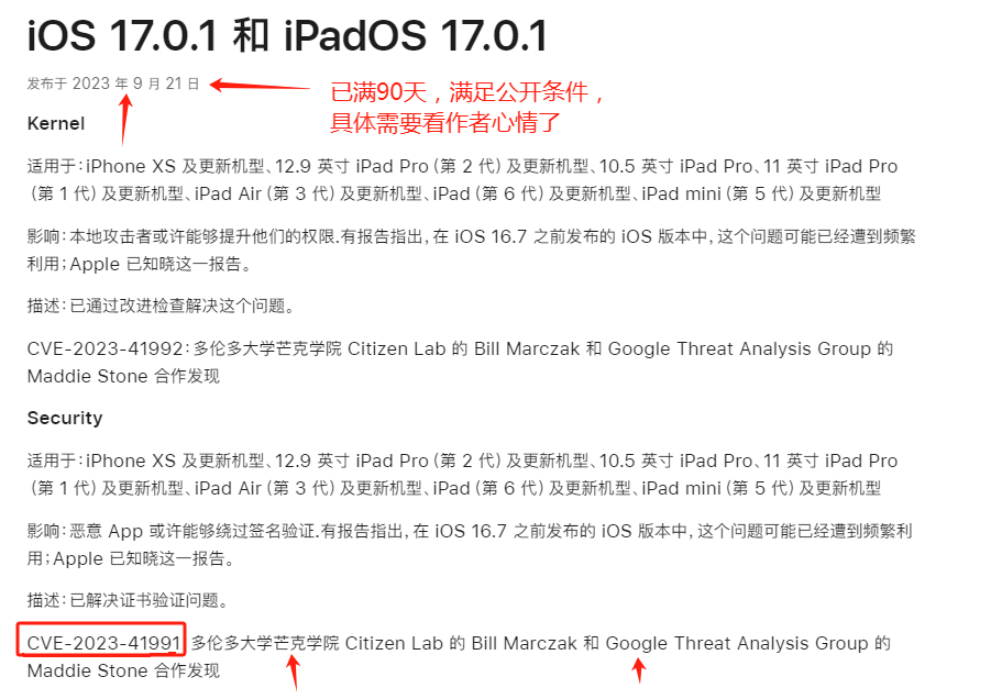 最好天天都有好消息,今天是2023年12月20日,距离漏洞CVE-2023-41991发布日已满90天了,接下来可以期待一下多伦多大学或者 Google 啥时候发布这个漏洞细节了。