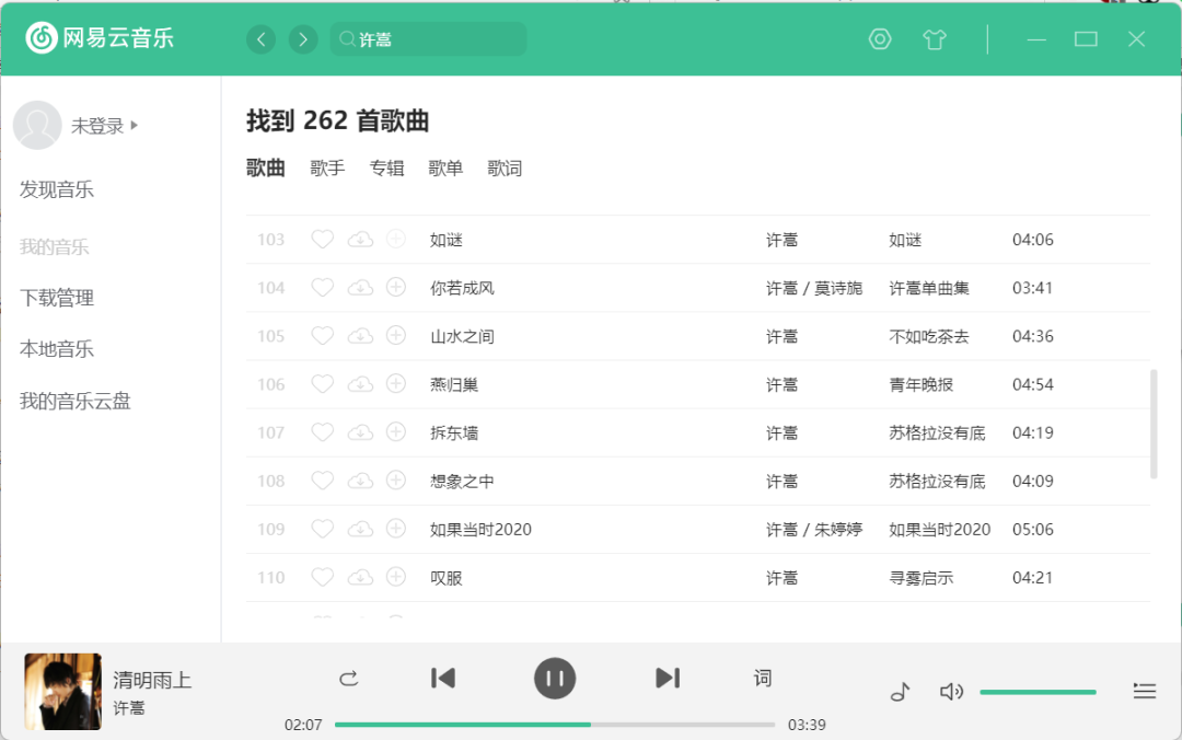 下图是使用搜索功能搜到的许嵩音乐,音乐播放起来比较流畅,内容也比较丰富,音质也还可以。