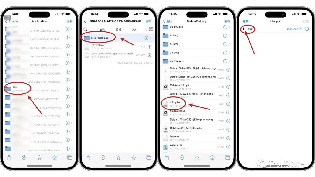2.找到电话助手的 APP(名称为:电话) 目录进去,找到里面的 info.plist 文件