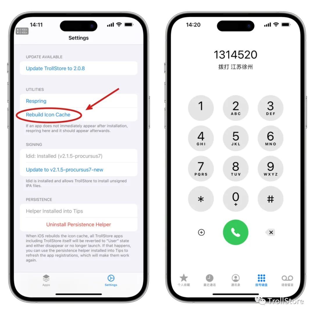 在桌面找到TrollStore点击Rebuild Icon Cache即可,注销后可以看到用巨魔商店安装的 电话 已经变成一个了!此官替成功! 未接来电即可有小红点