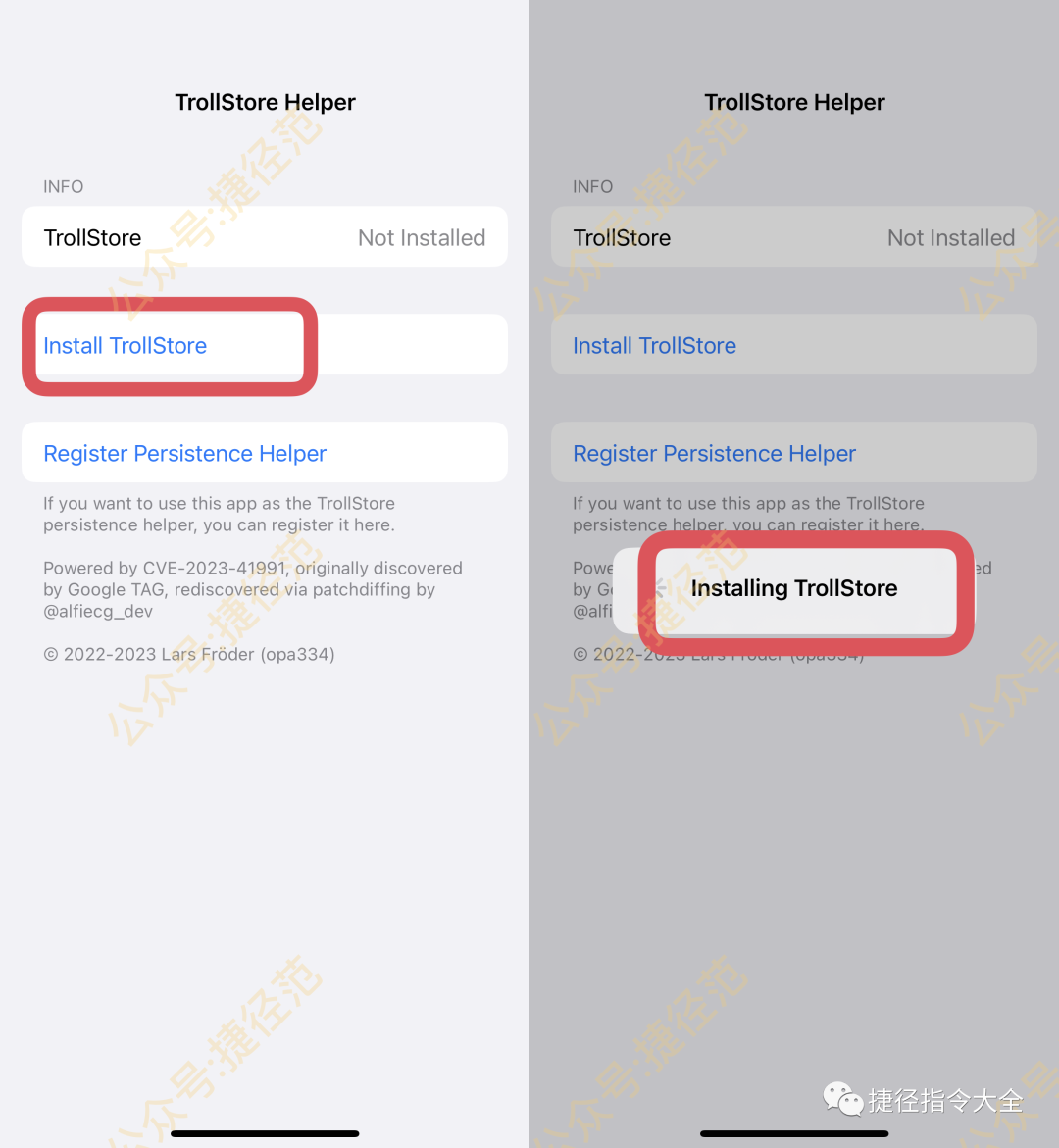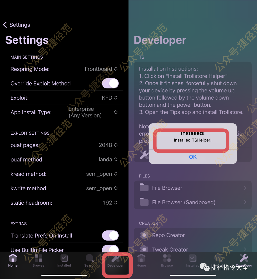 设置好之后,点击app的最右边的Deleloper,然后点击 insta TrollStore Helper ,点击之后,手机会卡住,稍等一下下,然会弹出如下方右图所示.代表此时已经安装成功,此时强制重启设备:快速按音量+-再长按电源键,重启手机后,打开提示app.然后安装TrollStore,稍等会自动注销设备,然后桌面上有个鬼脸图标,此时TrollStore2已经安装完成了.
