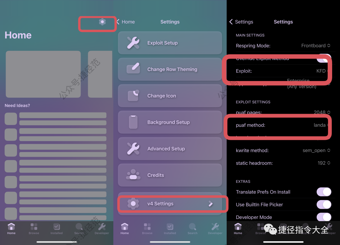 打开PureKFD,点击右上角的齿轮⚙️形状,滑到底部点击v4 Settings,然后Exploit这里选择KFD,Puaf method这里选择landa.