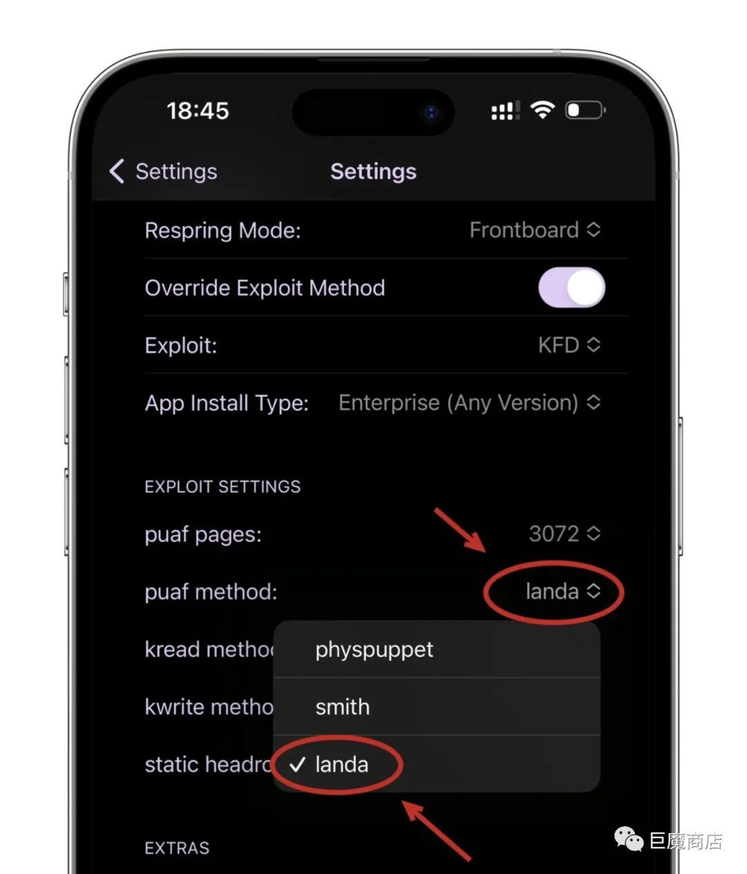下面来说说安装过程中可能遇到的两个问题,先说第一个:当你在安装的时候,你已经打开了Override Exploit Method 这个按钮,也把puaf method:改为了,landa。