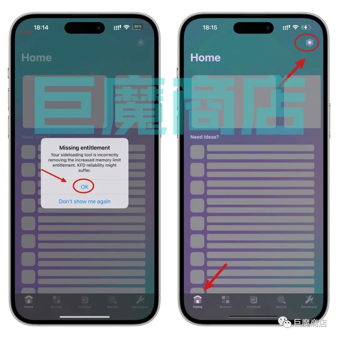 我们自签好PureKFD,点击打开它!打开PureKFD 会提示Missing entitlement Your sideloading tool is incorrectly removing the increased memory limit entitlement. KFD reliability might suffer. 我们点击ok ,点击ok 以后再点击右上角设置按钮。