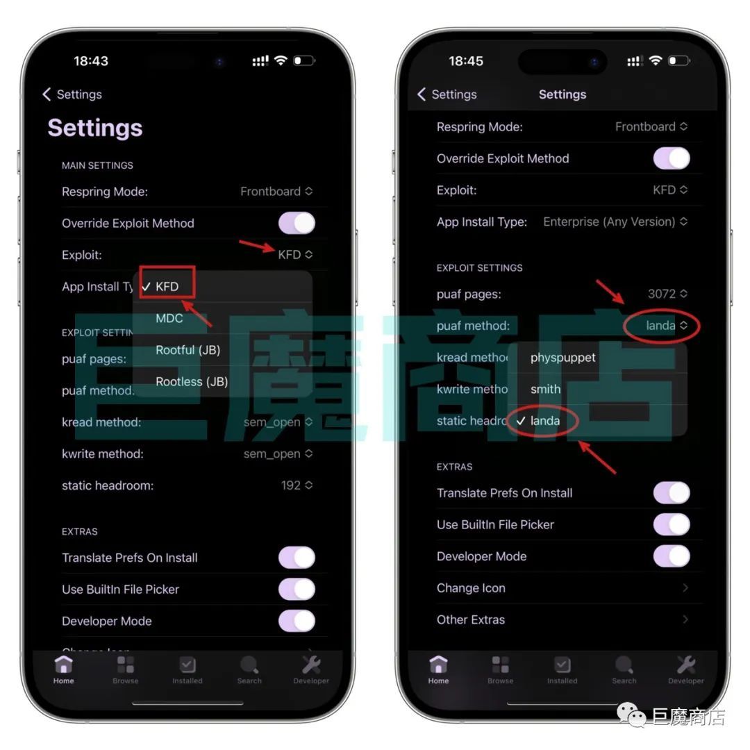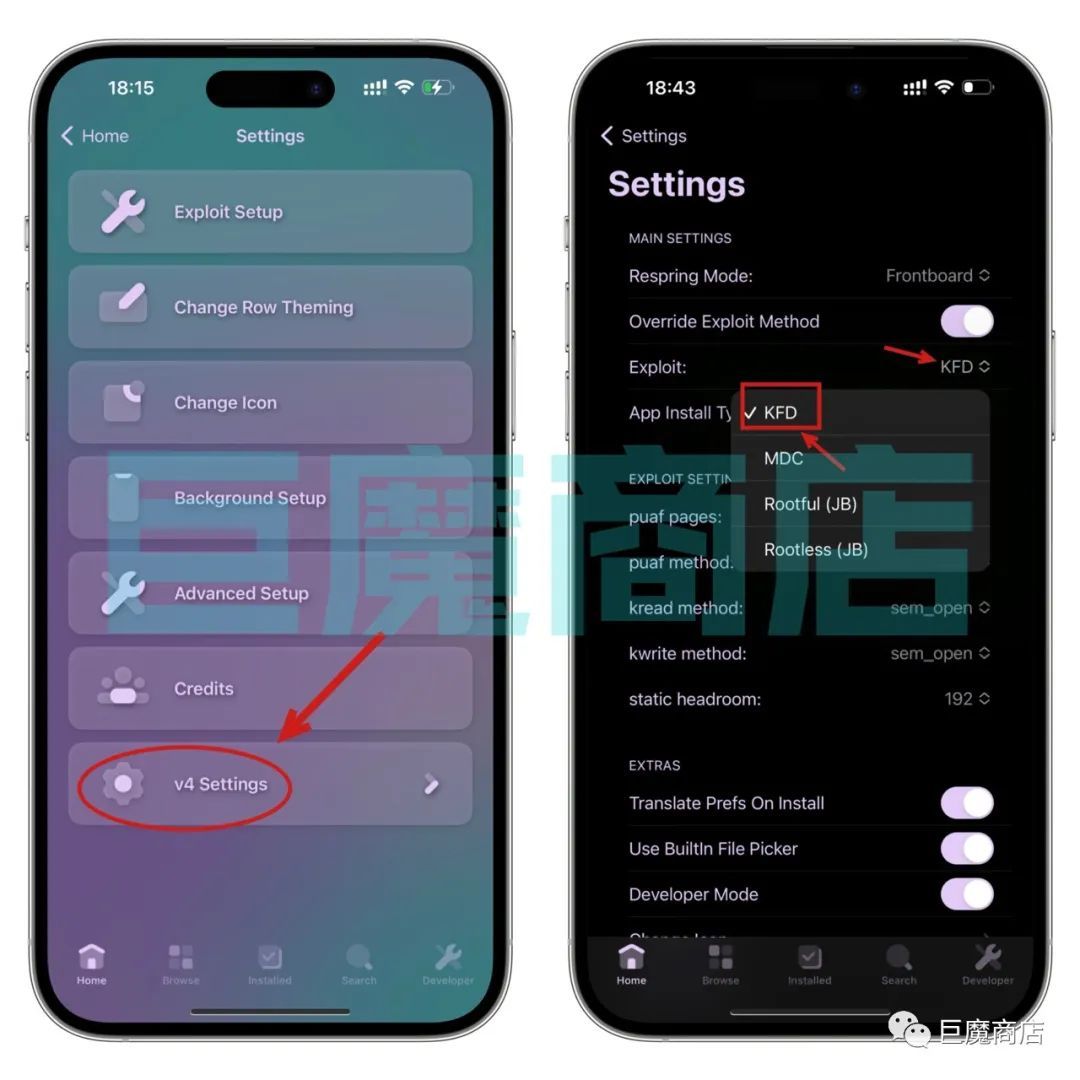 我们点击PureKFD主页home ,然后点击右上角设置,再点击v4 Settings,也就是刚开始操作的步骤,这里我们看到Exploit:是KFD模式,我们点击它,会弹出来四个选项KFD MDC Rootful (JB) Rootless (JB),我们点击MDC模式,点击以后,我们再点击Exploit:把它切换为KFD模式就好了,切换以后点击右下角Developer就可以去安装了。