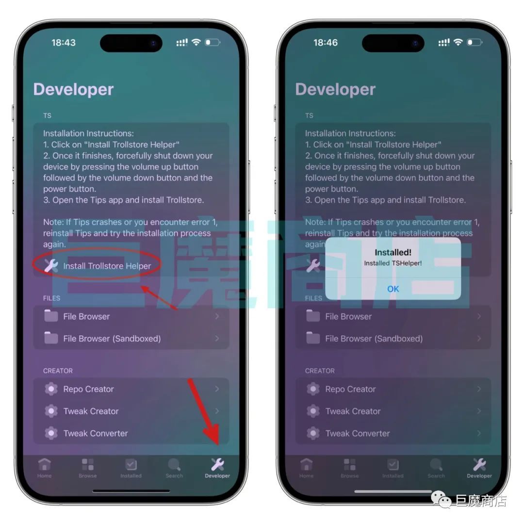上面步骤都操作好了以后,点击PureKFD右下角第一个Developer ,点击以后我们可以看到上图界面,接着点击Install Trollstore Helper,如果点击没有反应就多点几下,然后会出现上图二的界面。Installed!Instal ed Shelder ,它会出现是否点击ok ,这里我们不需要点击ok ,我们直接同时按住手机的音量➕键,和电源键,出现关机界面滑动关机,然后重启即可。