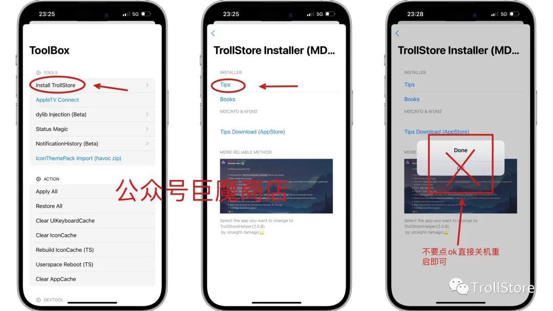 最后看到上图,我们点击第一个Install TrollStore 记得多点几下,反应有点慢,接着点击Tips 这里也可以多点几下,到了最后会出现是否点击ok 的界面,done ok 这里我们不要点ok 直接同时按着音量➕ 和关机键,滑动关机即可。
