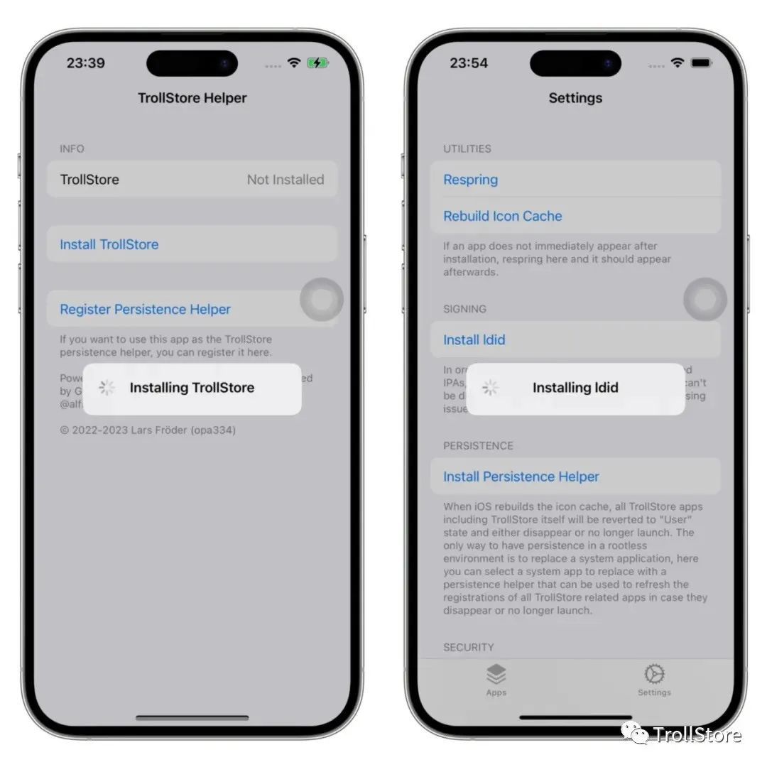 开机以后,我们打开提示app可以看到已经变成了TrollStore 巨魔商店的安装器了,我们点击Install TrollStore 安装巨魔商店,等他慢慢转圈,等一会儿菊花注销一下手机解锁,打开TrollStore 点击TrollStore 右下角的设置按钮点击Install Idid 等他慢慢转圈,最后出现did: Installed (v2.1.5-procursus7)就安装好了。
