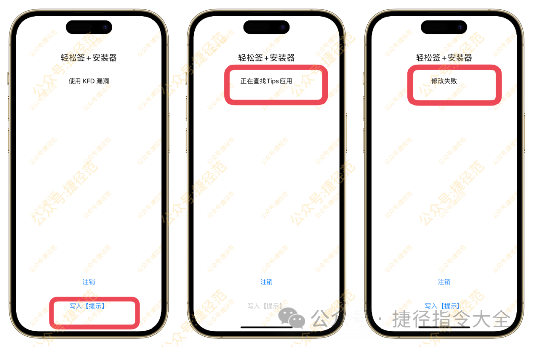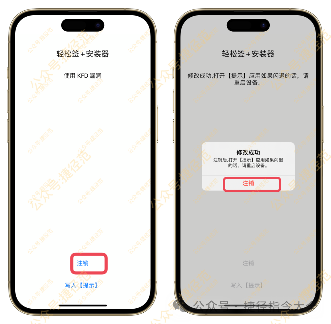 然后复制下方的地址,签名安装这个安装器,接着打开,点击写入提示,如果弹窗提示写入失败,我们先点击注销一次,然后再次点击写入提示,提示修改成功:注销后,打开提示应用如果闪退的话,请重启设备.