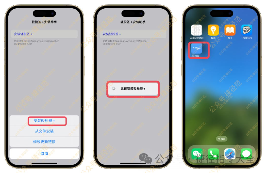 之前可以安装轻松签+,支持的系统是iOS14.0- iOS15.4.1所有的TrollStore用户直接安装,他同样是利用TrollStore的漏洞,安装后永久不会掉签,支持中文,15.4.1以下系统的同学可以直接前往轻松签官网安装,具体的教程可以前往公众号捷径范查看视频教程即可.