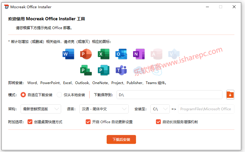 Mocreak可以根据你的系统自动识别下载合适的Office版本,它支持自定义选择组件,默认只下载部署Word、Excel 、PowerPoint,如果你需要其他组件,比如Project、Project、Publisher、Visio,只需要点亮对应的图标即可。