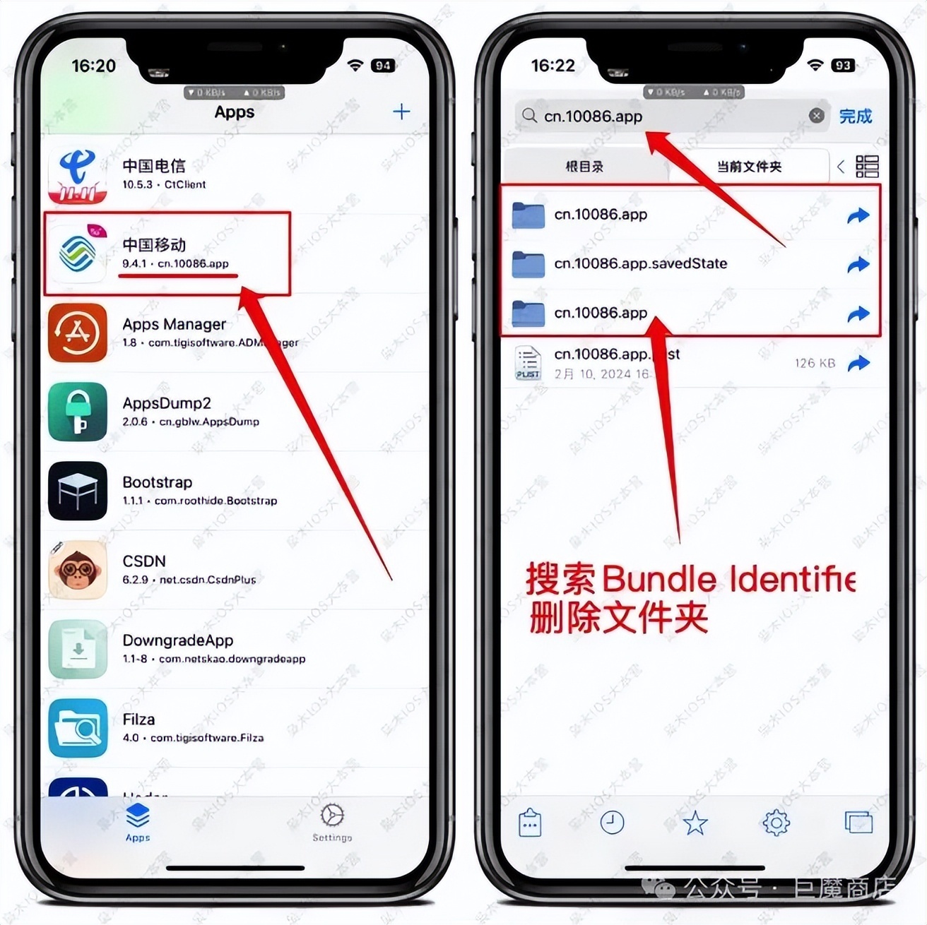 搜索 cn.10086.app ,找到这个文件夹,上右图框里面的都删掉它,里面都是残留。如果搜索不到,请在路径内慢慢查找类似名字的文件夹删掉。删除了以后打开App Store苹果应用商店重新下载即可