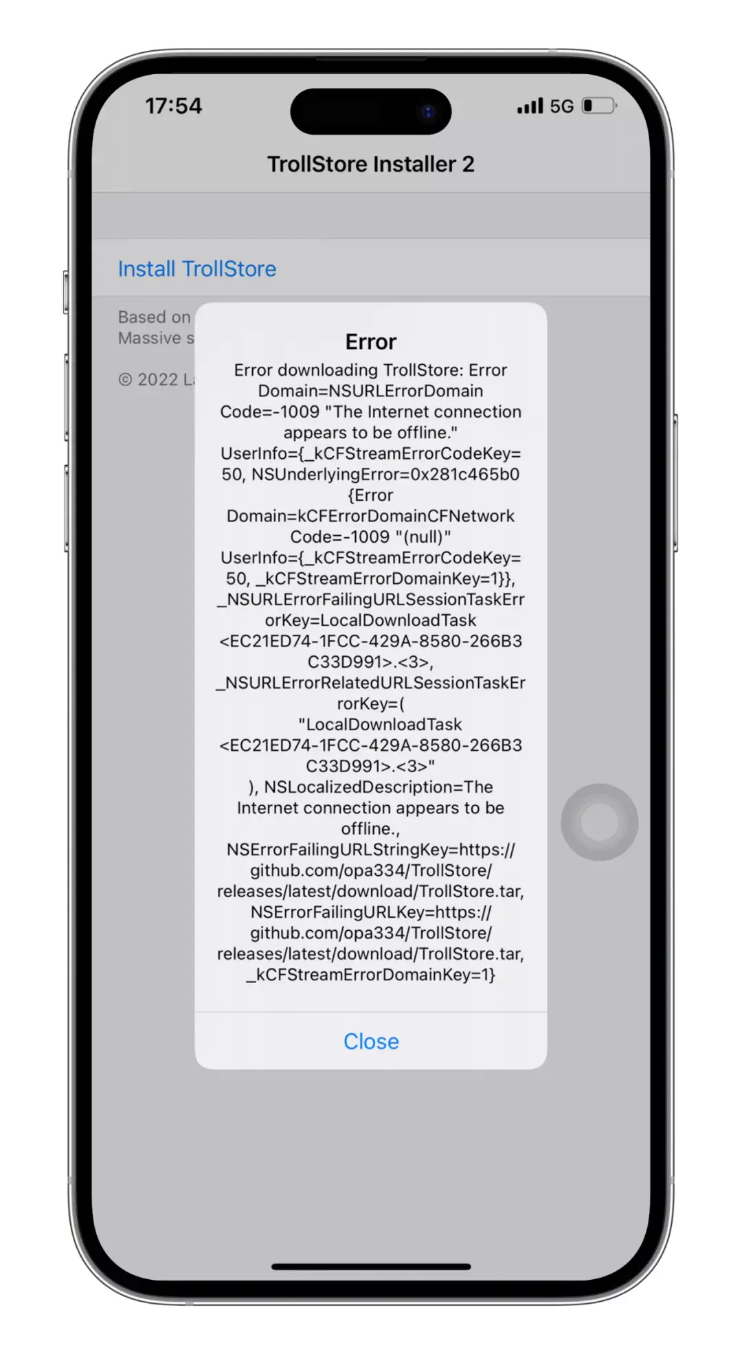 那为什么在点击Insttall TrollStore 出现Error提示?提示这个Error是什么意思?其实只要你动动你的小手翻译一下就明白它提示这个是因为没有网络导致的,那么为什么会这样?那是因为这款软件本来就是国外开发者开发的,所以在国内对于网络适配多多少少会存在问题!
