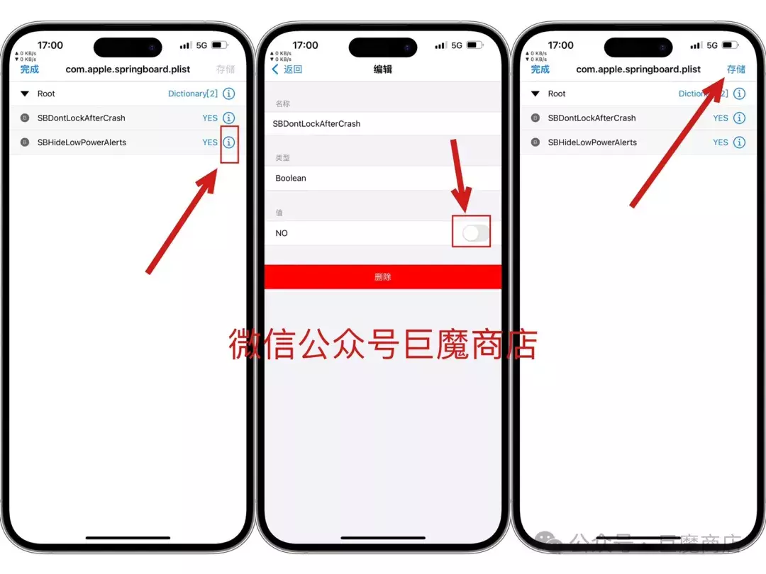如果后续你想打开低电量提醒功能了,操作方法也很简单,找到SBHideLowPowerAlerts 低电量提醒,点击 SBHideLowPowerAlerts 后面的感叹号,可以看到这里有一个打开和关闭的开关(参考上图中) 你想打开低电量提醒你只需点击关闭它,再点击返回,点击储存即可!默认提示yes都是关闭低电量提醒的意思,不要搞混淆了。no是打开低电量提醒。